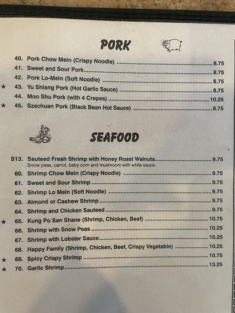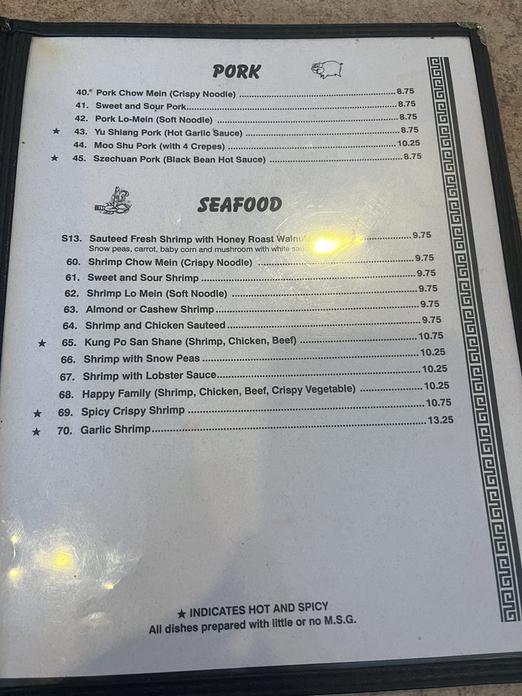 Indicates hot and spicy (no m.s.g.) Fresh shrimp crispy fried coated with red szechuan sauce